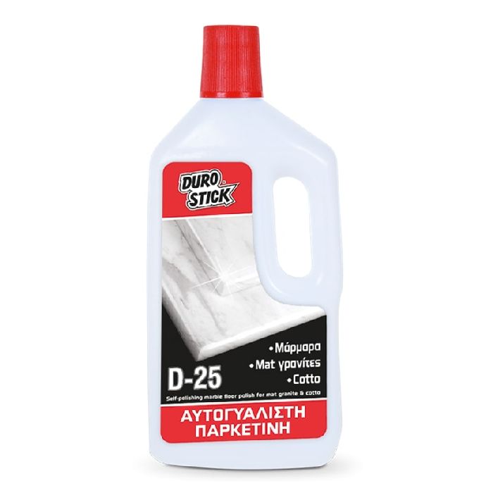 Αυτογυάλιστο υγρό, με βάση το κερί και ειδικά πολυμερή. Προσφέρει εξαιρετική λάμψη και προστασία σε παλιά ή νέα μάρμαρα, ματ γρανίτες και cotto, αναδεικνύοντας την αισθητική τους. Δημιουργεί μια διάφανη μεμβράνη προστασίας, είναι αντιολισθητικό, αντιστατικό και έχει ευχάριστο άρωμα. Το DUROSTICK D-25 συνιστάται ιδιαίτερα σε παλιά μάρμαρα και μωσαϊκά, διότι επαναφέρει τη χαμένη τους λάμψη. Είναι κατάλληλο για εσωτερικούς και εξωτερικούς χώρους καθώς επίσης και για προσόψεις κτιρίων, μνημεία, αγάλματα κ.α.