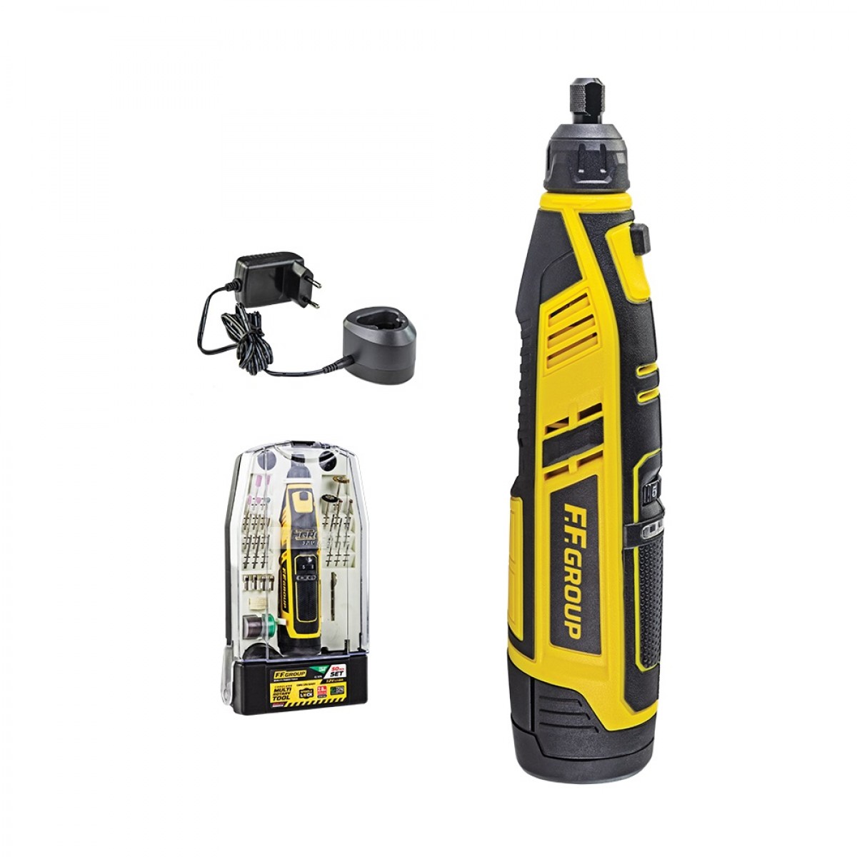 Παραδίδεται σε ανθεκτική πρακτική θήκη μεταφοράς, που περιλαμβάνει πληθώρα εξαρτημάτων για σκάλισμα, ακόνισμα, καθάρισμα, γυάλισμα, κόψιμο, τρίψιμο καθώς και έντυπες οδηγίες χρήσης